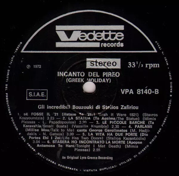 | Title | Incanto Del Pireo (Greek Holiday) - Gli Incredibili Bouzouki Di Stelios Zafiriou |