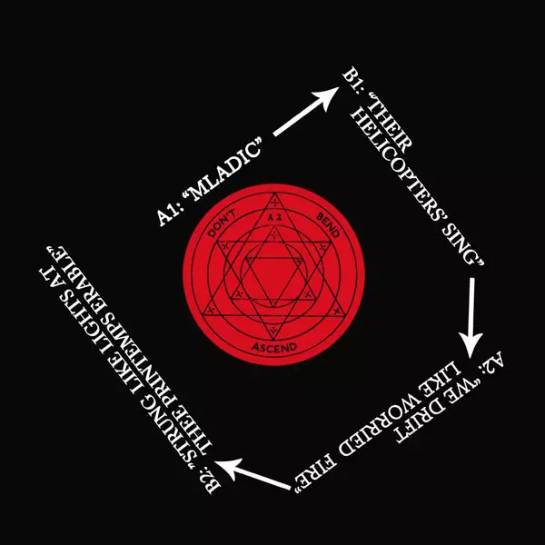 The single contains two drones, which are integrated into the context of the album on the CD, but separated on the vinyl to achieve a good print quality. The two songs "Mladic" and "We Drift Like Worried Fire" are the final versions of the two songs "Albanian" and "Gamelan", which the band already knows from concerts. The two tracks were recorde...