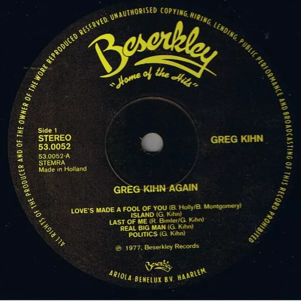 Greg Kihn: Greg Kihn Again version on vinyl LP in Standard edition. This particular edition was published in Netherlands in publishing company Beserkley year 1977. Album spans genres Rock and Pop Rock.