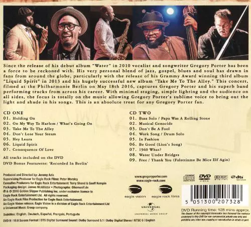 Gregory Porter's first concert film In May 2016, Gregory Porter presented his new studio album "Take Me To The Alley". In the same month, his fans in Germany had the opportunity to hear the new songs live. "Gregory Porter. The venue for the concert was not the Berlin Philharmonic on May 18, 2016. In an intimate setting, with a minimal stage and ...