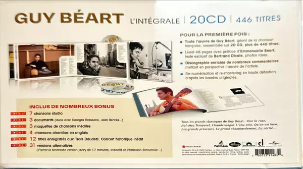 Guy Beart: Les Couleurs Du Temps - L'intégrale version on 20CD/Box Set in Remastered edition. This particular edition was published in France in publishing company Label Panthéon in cooperation with Mercury, Polydor, Disques Temporel and Universal Music France on 9. October 2020. Album spans genres Pop and Chanson.