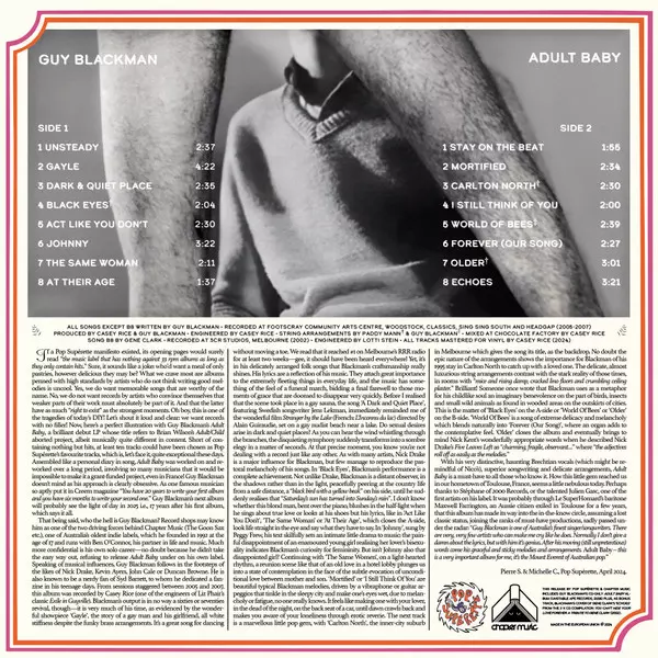 Guy Blackman: Adult Baby version on vinyl LP in Standard edition. This particular edition was published in Australia in publishing company Chapter Music in cooperation with Pop Supérette on 11. October 2024. Album spans genres Rock, Indie Rock and Lounge.