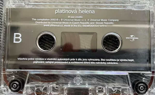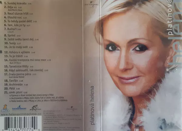 Helena Vondráčková: Platinová Helena version on MC in Standard edition. This particular edition was published in Czech Republic and Slovakia in publishing company Universal in cooperation with Bon Art Music on 11. November 2002. Album spans genres Pop, Vocal, Balad, Disco and Czechoslovakian classics.