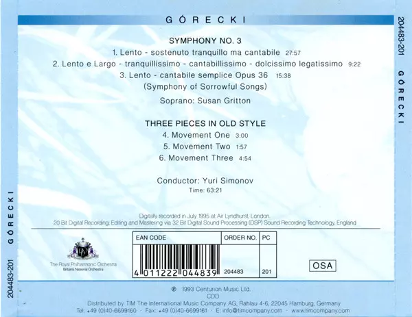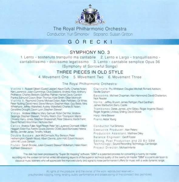 | Artist | The Royal Philharmonic Orchestra | Henryk Górecki | Susan Gritton | Yuri Simonov |