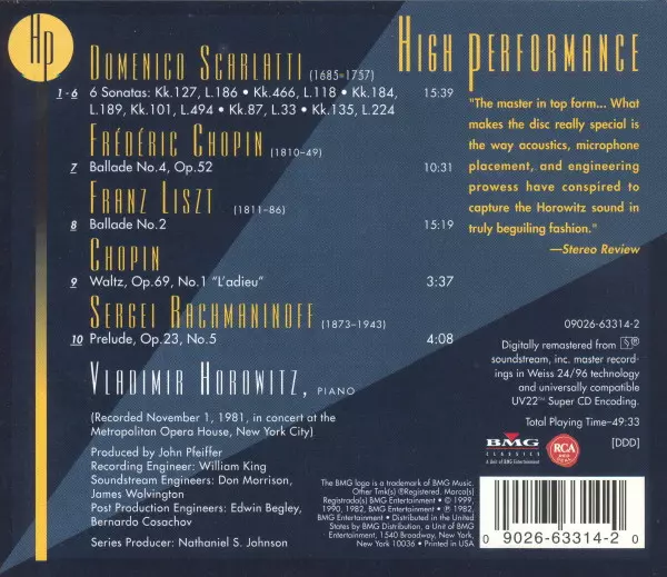 | Artist | Frédéric Chopin | Franz Liszt | Vladimir Horowitz | Domenico Scarlatti | Sergei Rachmaninoff |