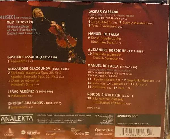 Yuli Turovsky: Violonchelo Espanol version on CD in Standard edition. This particular edition was published in Canada in publishing company Analekta year 2014. Album can be classified in the genre Classical.