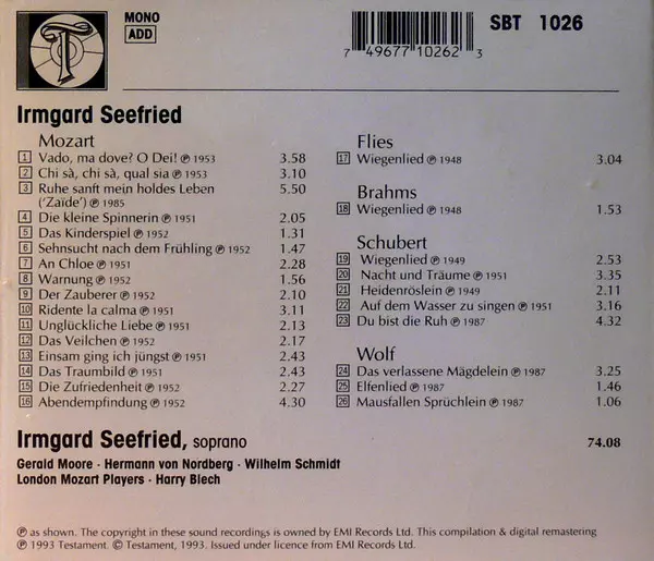 Irmgard Seefried: Mozart . Flies . Brahms . Schubert . Wolf version on CD in Standard edition. This particular edition was published in United Kingdom in publishing company Testament on 1. October 1993. Album spans genres Classical and Romantic.