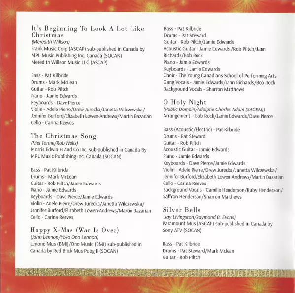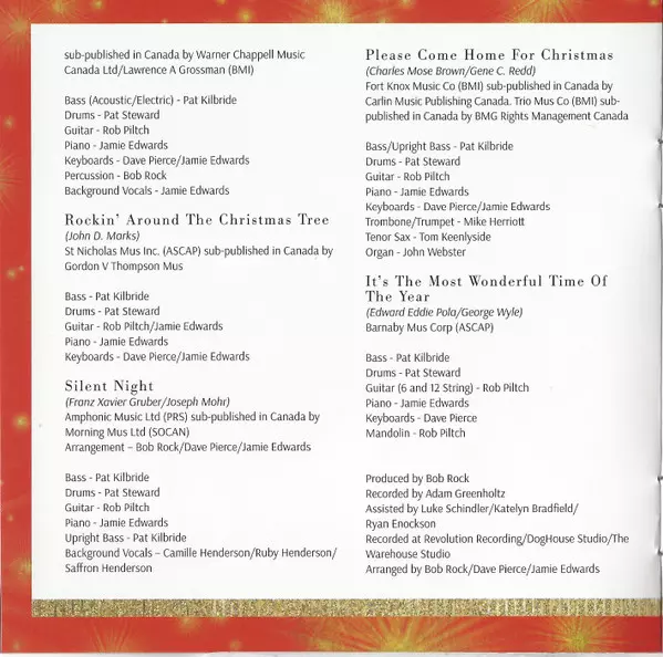 Arranged By [Arrangement] Bob Rock, Dave Pierce, Jamie Edwards | Backing Vocals [Background Vocals] Camille Henderson, Ruby Henderson, Saffron Henderson | Bass Pat Kilbride (2) | Cello Carina Reeves | Drums Pat Steward | Guitar Rob Piltch | Keyboards Dave Pierce, Jamie Edwards | Piano Jamie Edwards | Trombone Mike Herriott | Violin Adele Pierre, Drew Jurecka, Elizabeth Lowen-Andrews, Janetta Wilczewska, Jennifer Burford, Martin Bazarian | Written-By Gene Autry, Haven Gillespie, Irving Berlin, J. Fred Coots, James Lord Pierpont, Jule Styne And Sammy Cahn, Oakley Haldeman
