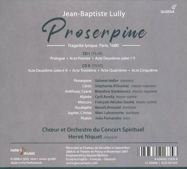 Hervé Niquet: Proserpine version on 2CD in Standard edition. This particular edition was published in Europe in publishing company Glossa on 15. August 2025. Album spans genres Classical, Baroque and Opera.