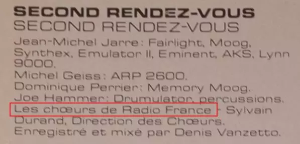 Choir Chœur de Radio France | Directed By [Direction Des Choeurs] Sylvain Durand | Drum Programming [Drumulator], Percussion Joe Hammer | Synthesizer [ARP 2600] Michel Geiss | Synthesizer [Fairlight, Moog, Synthex, Emulator II, AKS], Organ [Eminent], Drum Machine [Lynn 9000] Jean-Michel Jarre | Synthesizer [Memory Moog] Dominique Perrier