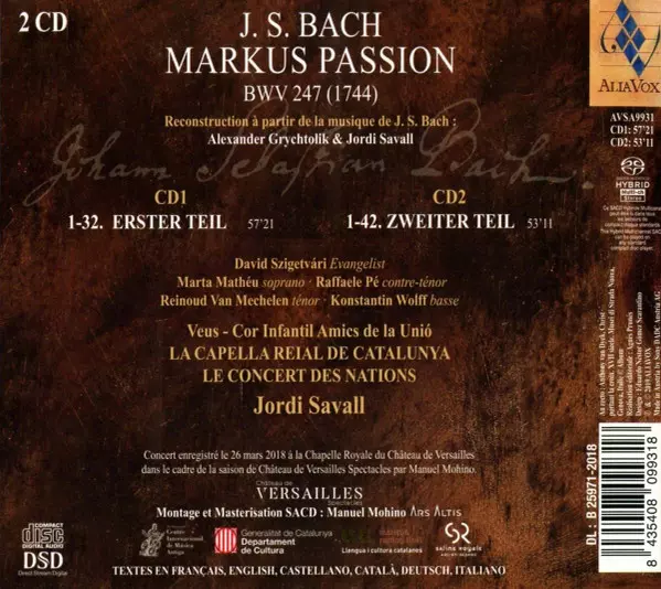| Artist | Johann Sebastian Bach | Jordi Savall | Reinoud Van Mechelen | Le Concert Des Nations | La Capella Reial De Catalunya | Raffaele Pe | Konstantin Wolff | Marta Mathéu | David Szigetvári | Veus - Cor Infantil Amics De La Unió |