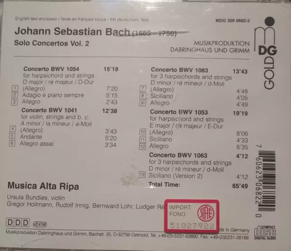 | Title | Solo Concertos Vol. 2 (Violin Concerto A Minor BWV 1041, Harpsichord Concertos BWV 1053, 1054, 1063) |