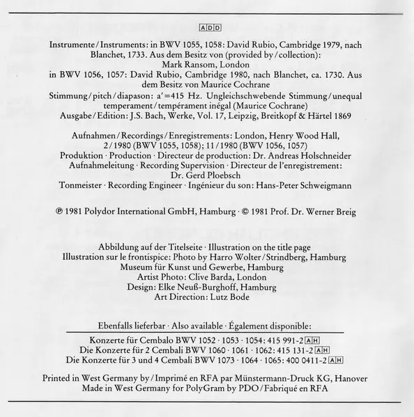 | Title | Konzerte Für Cembalo Und Streicher = Concertos For Harpsichord And Strings = Concertos Pour Clavecin Et Orchestre À Cordes BWV 1055 · 1056 ·1057 · 1058 |