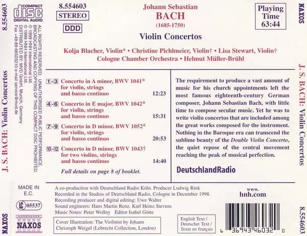 | Artist | Johann Sebastian Bach | Kölner Kammerorchester | Helmut Müller-Brühl | Kolja Blacher | Christine Pichlmeier | Lisa Stewart |