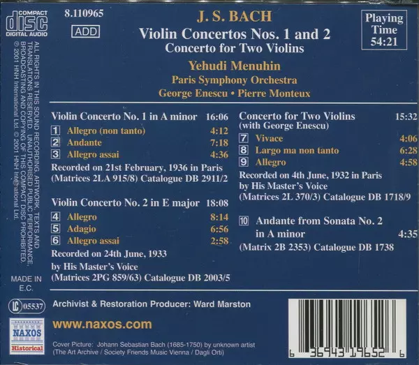 | Artist | Johann Sebastian Bach | Yehudi Menuhin | George Enescu | Pierre Monteux | Orchestre Symphonique De Paris |