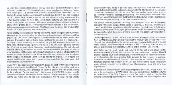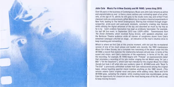 John Cale: Music For A New Society / M:FANS version on 2CD in Remastered edition. This particular edition was published in Europe and UK in publishing company Domino in cooperation with Electric Drone on 5. February 2016. Album spans genres Rock, New Wave and Art Rock.