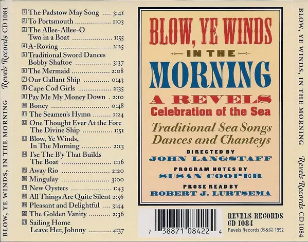 John Langstaff: Blow, Ye Winds, In The Morning (A Celebration Of The Sea) version on CD in Standard edition. This particular edition was published in USA in publishing company Revels Records on 21. March 1995. Album spans genres Folk, World, & Country, Non-Music, Children, Folk and Spoken word.