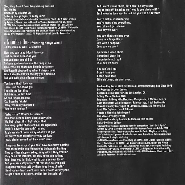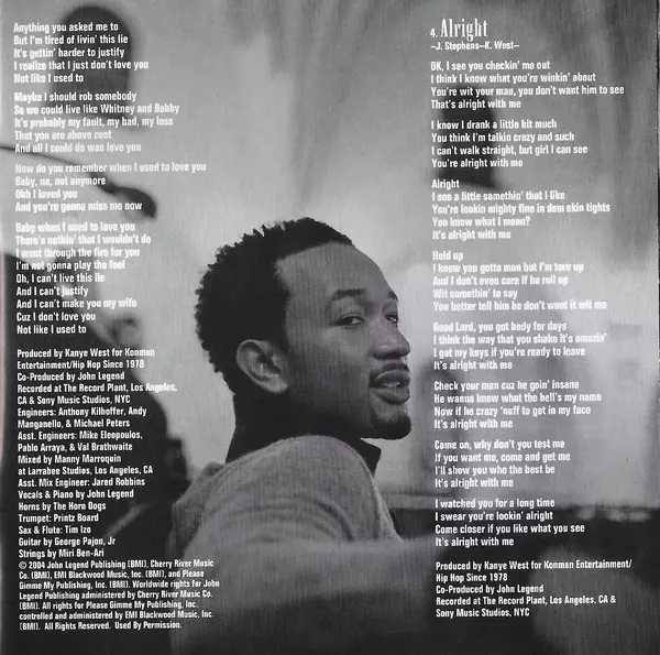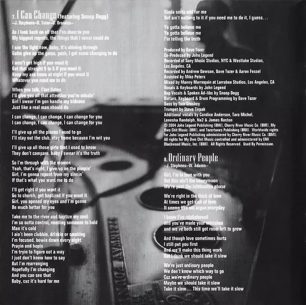 Guitar George Pajon Jr. | Horns The Horn Dogs | Saxophone, Flute Tim "Izo" Orindgreff | Strings Miri Ben-Ari | Trumpet Printz Board | Vocals, Piano John Legend | Written-By John Stephens (3), Kanye West