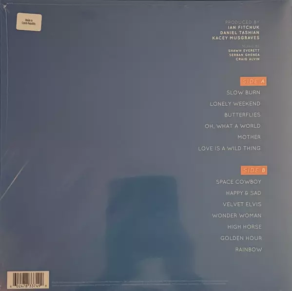 "Golden Hour" is the fourth studio album by American country music artist Kacey Musgraves, released on March 30, 2018, through MCA Nashville. The album marks a departure from the traditional country sound of her previous records, blending country with pop, disco, and electronica influences. Comprising 13 tracks, "Golden Hour" features songs such as the reflective "Mother," the uplifting "Butterflies," and the empowering "Wonder Woman." The poignant ballad "Rainbow" serves as a beacon of hope, while "Space Cowboy" spins a tale of letting go. The album opens with "Slow Burn," setting a mellow tone that carries throughout the record. Other tracks include the introspective "Lonely Weekend," the enchanting "Oh, What A World," and the contemplative "Love Is A Wild Thing." Musgraves explores the complexities of emotions in "Happy & Sad," offers a playful vibe with "Velvet Elvis," and brings an infectious disco beat to "High Horse." The title track, "Golden Hour," encapsulates the warm essence of the album. Musgraves co-produced the album with Daniel Tashian and Ian Fitchuk, and it has been praised for its bold experimentation and introspective songwriting.