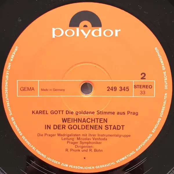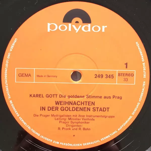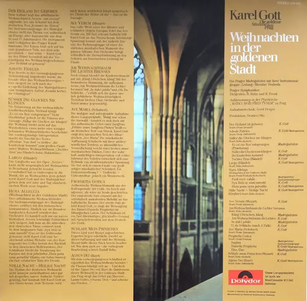 Karel Gott: Weihnachten In Der Goldenen Stadt version on vinyl LP in Standard edition. This particular edition was published in Germany in publishing company Polydor year 1969. Album spans genres Pop, Vocal, Folk, Christmas and Czechoslovakian classics. Gatefold Vinyl.
