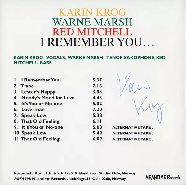 | Artist | Karin Krog | Warne Marsh | Red Mitchell |
