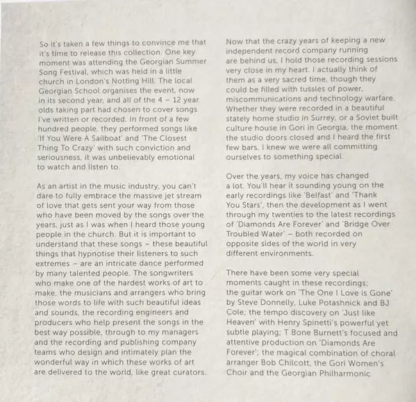 30 songs in 15 years, the ultimate collection In 2018, Georgian-British singer, songwriter and musician Katie Melua dares to look back and presents "The Ultimate Collection", a career-best 30 songs in 15 years and seven studio albums. The song selections were made by Katie Melua herself. In addition to classic tracks and hits, her "Ultimate Collection" also includes a cover version of Sting's "Fields Of Gold" and two brand new covers of Simon & Garfunkel's "Bridge Over Troubled Water", recorded in Georgia in 2018 with the Gori Women's Choir and the Georgian Philharmonic Orchestra, and Shirley Bassey's "Diamonds Are Forever". "Ultimate Collection", the title of this collection says it all, because you won't get more Katie Melua on one album.