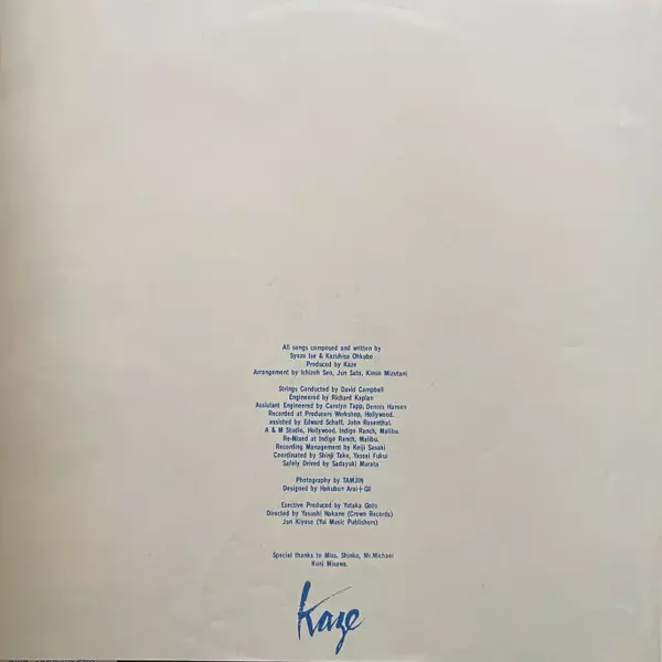 Arranged By Ichizo Seo | Backing Vocals Shozo Ise | Bass Hideaki Takebe | Drums Jun Moriya | Electric Guitar Kimio Mizutani | Electric Piano, Synthesizer [Oberheim], Strings [String Ensemble] Jun Sato | Percussion Steve Forman | Words By, Music By, Lead Vocals Kazuhisa Okubo