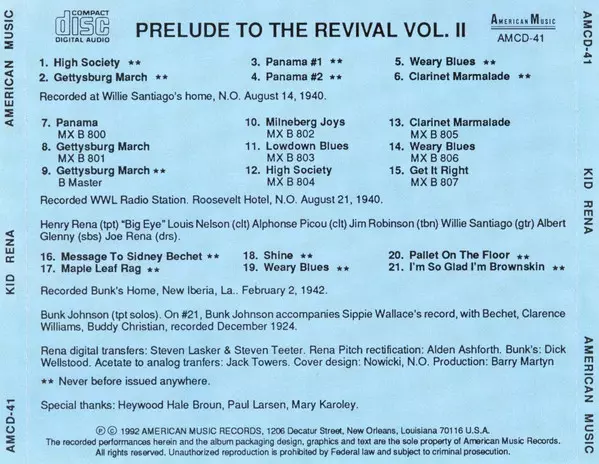 Title | Prelude To The Revival Vol. II (Kid Rena 1940 / Bunk Johnson: The Very First Recordings) |
