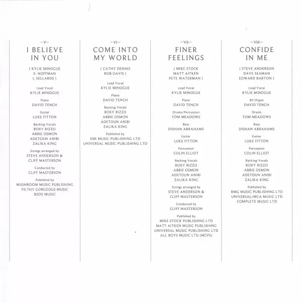 Arranged By [Strings] Cliff Masterson, Steve Anderson | Backing Vocals Abbie Osmon, Adetoun Anibi, Roxanne Wilde, Zalika King | Bass Dishan Abrahams | Conductor Cliff Masterson | Drums Tom Meadows | Guitar Luke Fitton | Lead Vocals Kylie Minogue | Percussion Colin Elliot | Piano, Keyboards Steve Anderson | Strings Royal Philharmonic Orchestra | Written-By Kylie Minogue, Steve Anderson