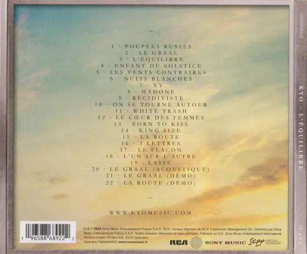 Kyo: L'Équilibre - 10 Ans DLX version on CD in deluxe edition. This particular edition was published in France in publishing company RCA in cooperation with Sony Music on 7. June 2024. Album spans genres Rock and Pop.