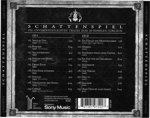 Lacrimosa: Schattenspiel version on 2CD in Standard edition. This particular edition was published in Switzerland in publishing company Hall Of Sermon on 15. June 2010. Album spans genres Rock, Gothic Rock and Symphonic Rock.