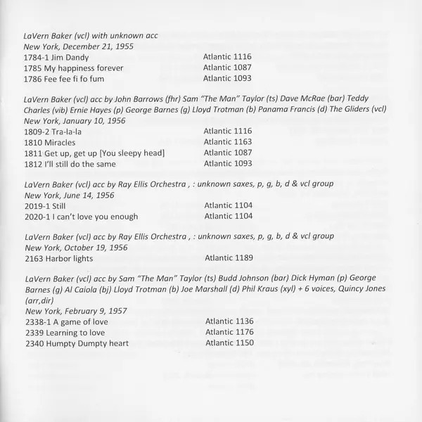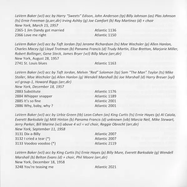 | Arranged By, Directed By Gene Redd | Baritone Saxophone Pinky Williams | Bass Lloyd Trotman (2) | Drums Sylvester "Vess" Payne | Guitar Jimmy Lewis (8) | Piano Hank Jones | Tenor Saxophone Freddie Mitchell | Written-By Jerry Wexler, LaVern Baker | |||