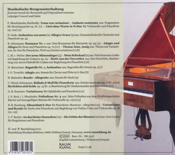 Leipziger Concert: Musikalische Morgenunterhaltung version on CD in Standard edition. This particular edition was published in Germany in publishing company Raumklang on 13. July 2012. Album spans genres Classical and Romantic.