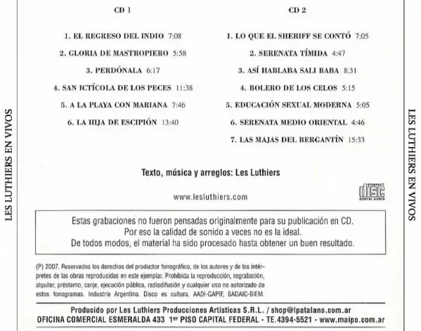 Les Luthiers: En Vivos version on 2CD in Standard edition. This particular edition was published in Argentina in publishing company Not On Label (Les Luthiers Self-released) on 17. November 2017. Album spans genres Classical, Stage & Screen, Non-Music, Latin, Komedie and Monolog.