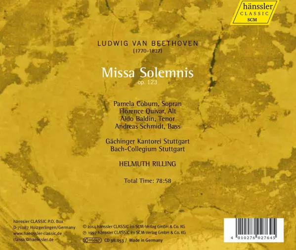 | Artist | Ludwig van Beethoven | Helmuth Rilling | Gächinger Kantorei Stuttgart | Bachcollegium Stuttgart | Florence Quivar | Andreas Schmidt | Pamela Coburn | Aldo Baldin |