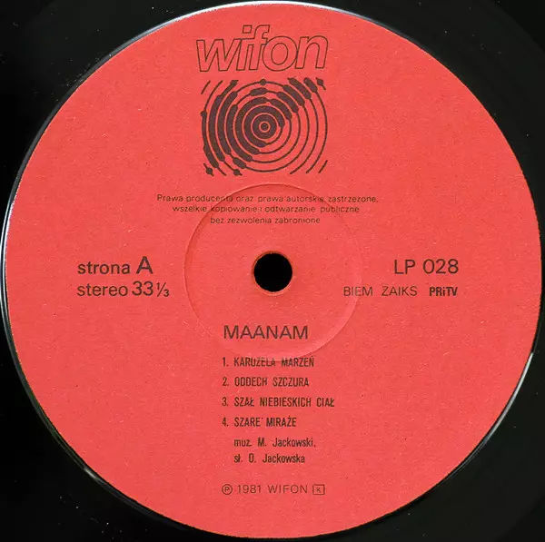 Maanam: Maanam version on vinyl LP in Standard edition. This particular edition was published in Poland in publishing company Wifon year 1982. Album spans genres Rock, New Wave and Post-Punk. Red Labels Misprint Vinyl.