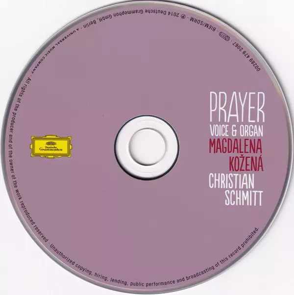 Magdalena Kožená: Prayer - Voice & Organ version on CD in Standard edition. This particular edition was published in Europe in publishing company Deutsche Grammophon on 8. April 2014. Album spans genres Classical, Baroque, Modernism, Romantic and Impressionistic.