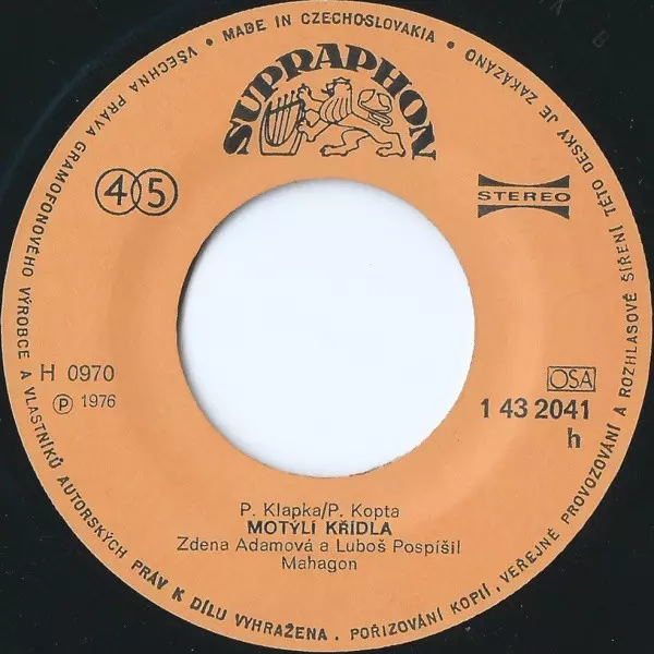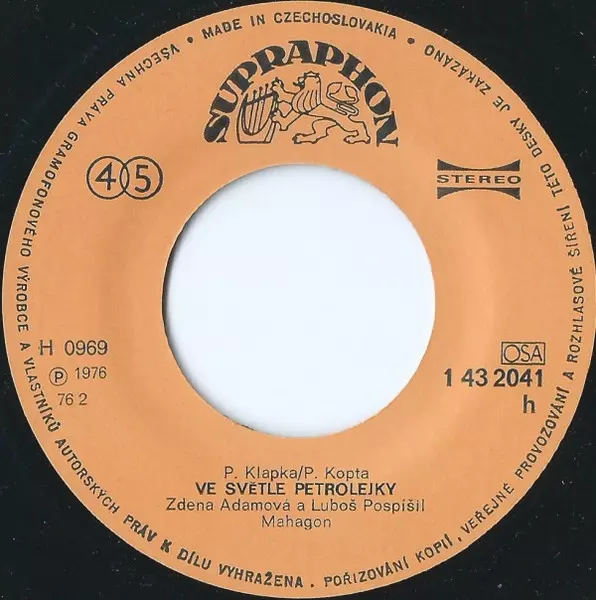 Mahagon: Ve Světle Petrolejky / Motýlí Křídla version on vinyl SP in 45 RPM edition. This particular edition was published in Czechoslovakia in publishing company Supraphon year 1976. Album spans genres Rock, Jazz, Funk / Soul, Fusion, Jazz-Rock and Jazz-Funk.