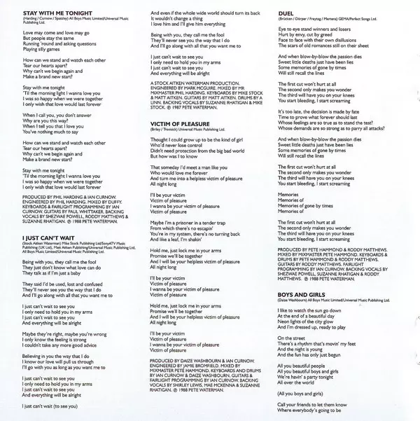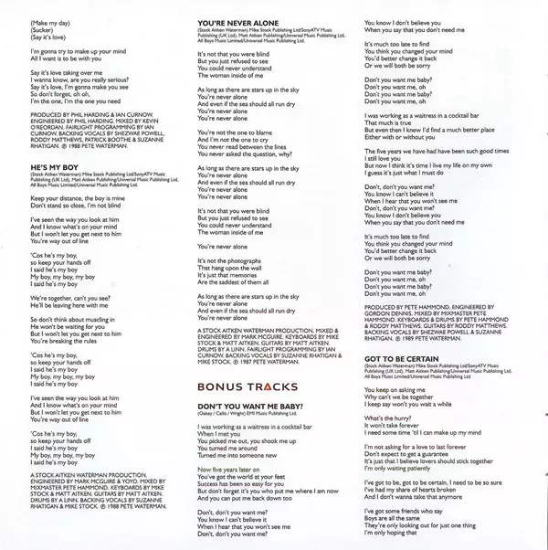 Backing Vocals Mike Stock, Suzanne Rhatigan | Drums A. Linn | Guitar Matt Aitken | Keyboards Stock/Aitken | Mixed By, Engineer Mark McGuire | Producer, Written-By Stock, Aitken & Waterman | Programmed By [Fairlight Programming] Ian Curnow