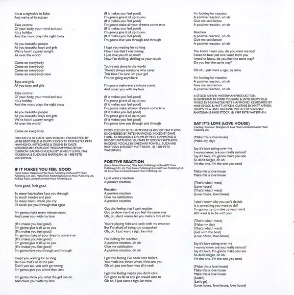 Backing Vocals Mike Stock, Suzanne Rhatigan | Drums A. Linn | Engineer Jamie Bromfield, Mark McGuire | Guitar Matt Aitken | Keyboards Stock/Aitken | Mixed By Pete Hammond | Producer, Written-By Stock, Aitken & Waterman