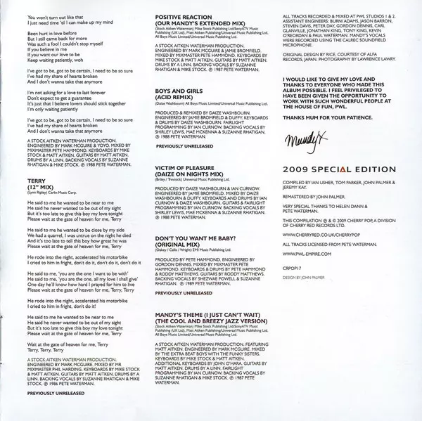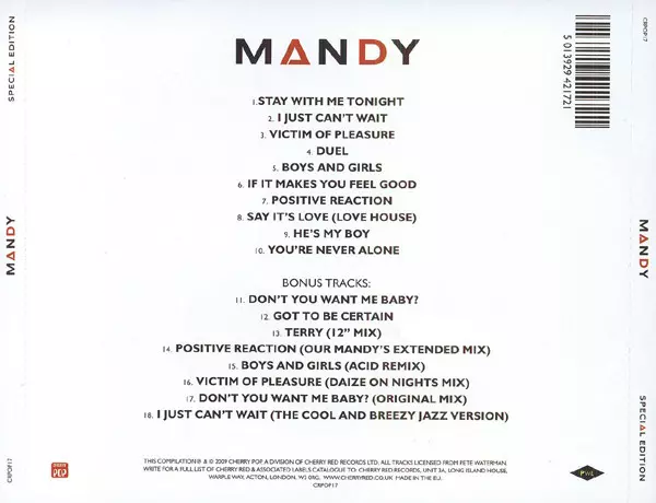 Mandy Smith: Mandy version on CD in Remastered edition. This particular edition was published in United Kingdom in publishing company Cherry Pop on 15. March 2024. Album spans genres Pop, Electronic and Europop. Special Edition.