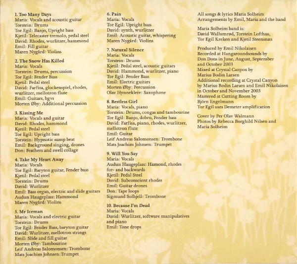Backing Vocals, Drone Emil Nikolaisen | Double Bass Tor Egil Kreken | Drum Programming [Hypnotic Sump Beat] Torstein Lofthus | Electric Piano [Rhodes], Organ [Hammond] David Wallumrød | Guitar [Pedal Steel] Kjetil Steensnæs | Other [Feathers And Swell Collage] Don | Vocals Maria Solheim