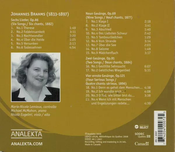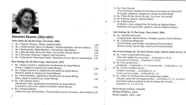 | Artist | Johannes Brahms | Marie-Nicole Lemieux | Michael McMahon | Nicolò Eugelmi |