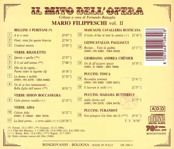 Mario Filippeschi: Mario Filippeschi Vol. II version on CD in Standard edition. This particular edition was published in Italy in publishing company Bongiovanni on 1. February 1994. Album spans genres Classical and Opera.