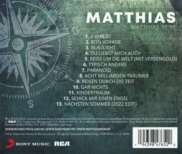 Matthias Reim: Matthias version on CD in Standard edition. This particular edition was published in Germany in publishing company RCA Deutschland on 21. January 2022. Album spans genres Rock, Pop, Folk, World, & Country, Reggae, Schlager, Pop Rock, Soft Rock and Europop.