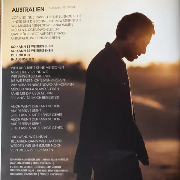 Drums Kallas, Martin Haller | Electric Bass Paul Sieferle | Electric Guitar Martin Haller | Keyboards Jens Schneider (4), Martin Haller | Programmed By Jens Schneider (4) | Vocals Max Giesinger | Written-By Jens Schneider (4), Martin Haller, Max Giesinger