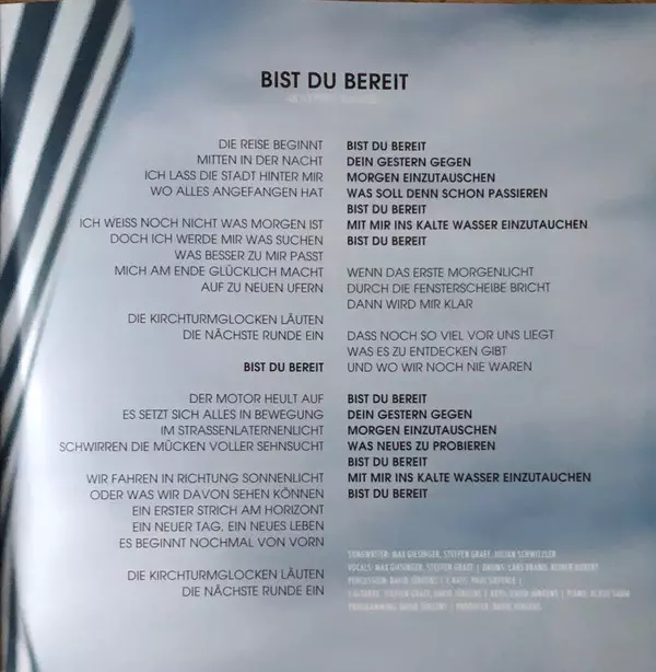 Drums Lars Brand, Reiner Hubert | Electric Bass Paul Sieferle | Electric Guitar David Jürgens, Steffen Graef | Keyboards David Jürgens | Percussion David Jürgens | Piano Klaus Sahm | Programmed By David Jürgens | Vocals Max Giesinger, Steffen Graef | Written-By Julian Schwizler, Max Giesinger, Steffen Graef