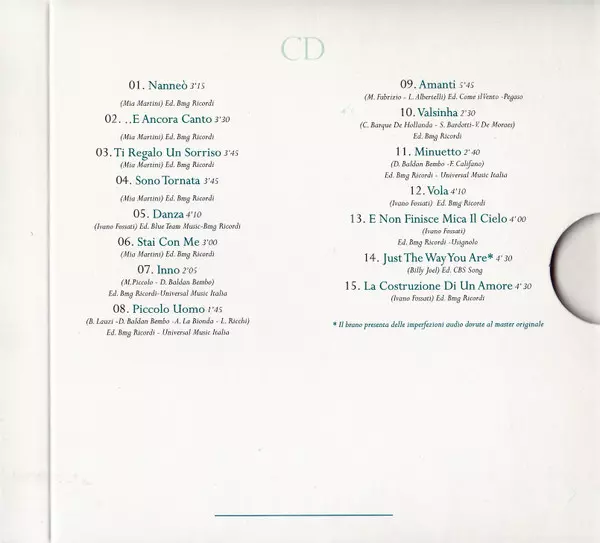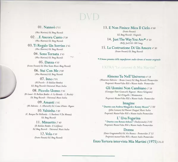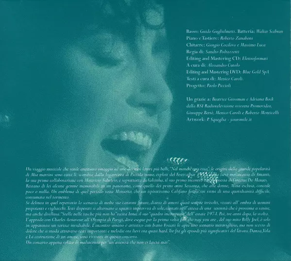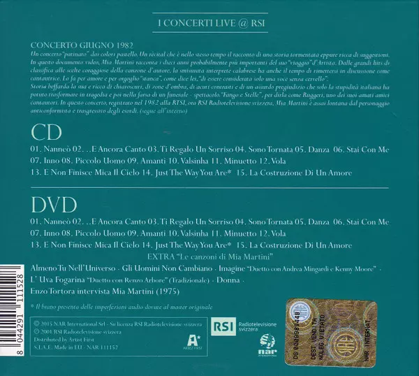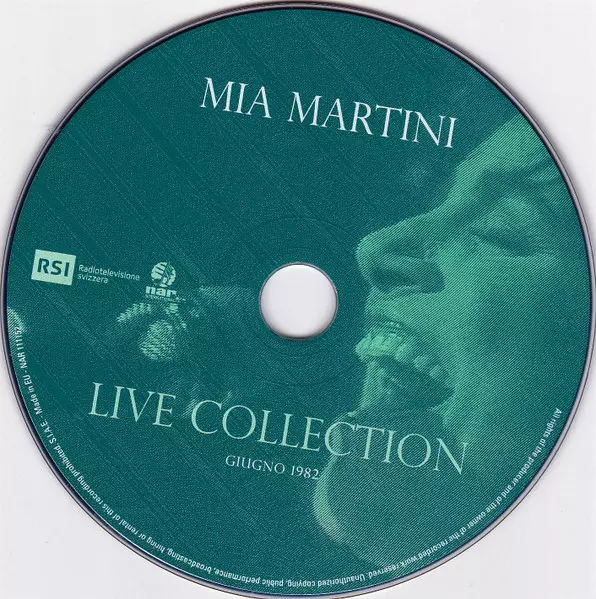 Mia Martini: Live Collection version on CD/DVD in Remastered edition. This particular edition was published in Italy in publishing company NAR International in cooperation with RSI Radiotelevisione Svizzera on 25. September 2015. Album spans genres Pop and Chanson.