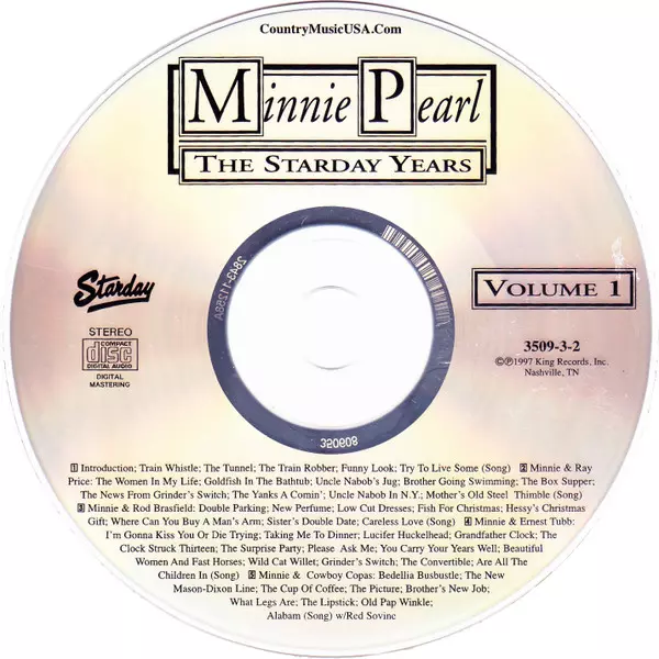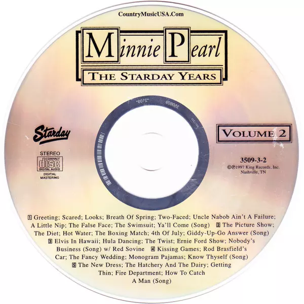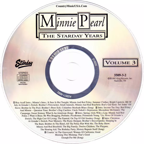 Minnie Pearl: The Starday Years - Classic Minnie Pearl version on 3CD in Remastered edition. This particular edition was published in USA in publishing company Starday Records on 24. March 1998. Album spans genres Folk, World, & Country, Non-Music, Country and Komedie.