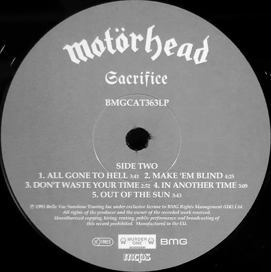 Motörhead: Sacrifice version on vinyl LP in Standard edition. This particular edition was published in Europe in publishing company BMG on 29. March 2019.